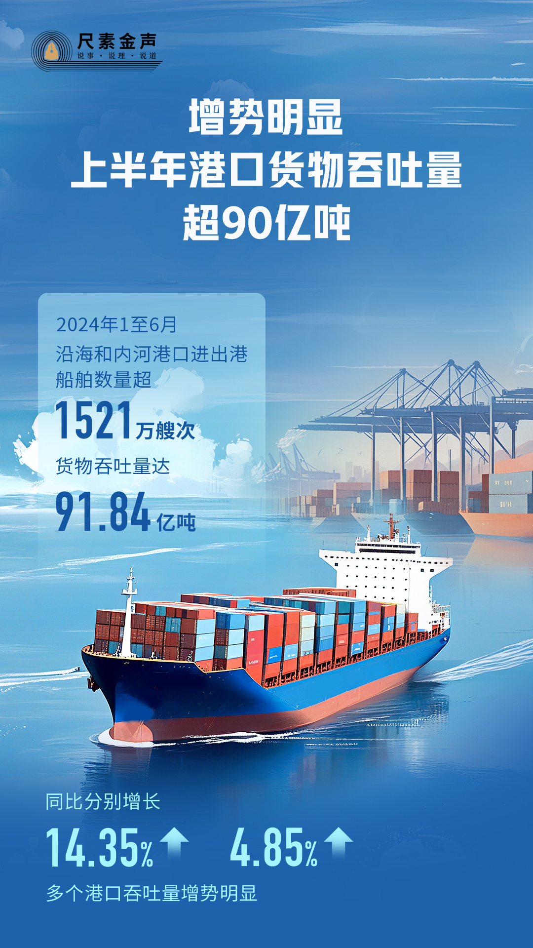 港口,貨物進出口的重要門戶;港口貨物吞吐量,國民經(jīng)濟發(fā)展的“晴雨表”。日前,中國港口運行“半年報”公布:今年1至6月,沿海和內(nèi)河港口進出港船舶數(shù)量超1521萬艘次,貨物吞吐量達91.84億噸,同比分別增長14.35%、4.85%,多個港口吞吐量增勢明顯。