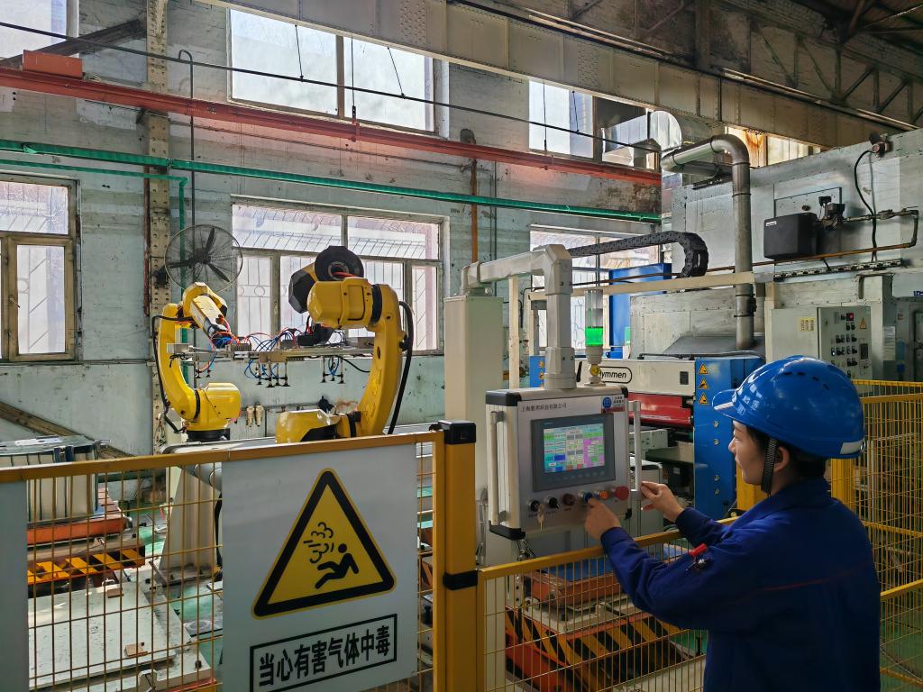 2024年上半年,東輕“數(shù)智化圓錠加工園區(qū)”正式落成。在這條由蘇聯(lián)援建的鋁合金中小直徑圓錠生產(chǎn)線上,機(jī)器人無需人工干預(yù),通過全自動的定位和抓取,短時間內(nèi)就能完成上料填裝等全套流程。“改造前,這條生產(chǎn)線各道工序均需人工參與,效率較低且伴有高強(qiáng)度重復(fù)性勞動?!睎|輕熔鑄廠設(shè)備保障組二級技師王驍睿介紹,“機(jī)器人操作在保障生產(chǎn)進(jìn)度、提高作業(yè)質(zhì)量的同時,有效緩解了崗位人手配置壓力。人機(jī)分離后,安全保障也得到了明顯提升。”