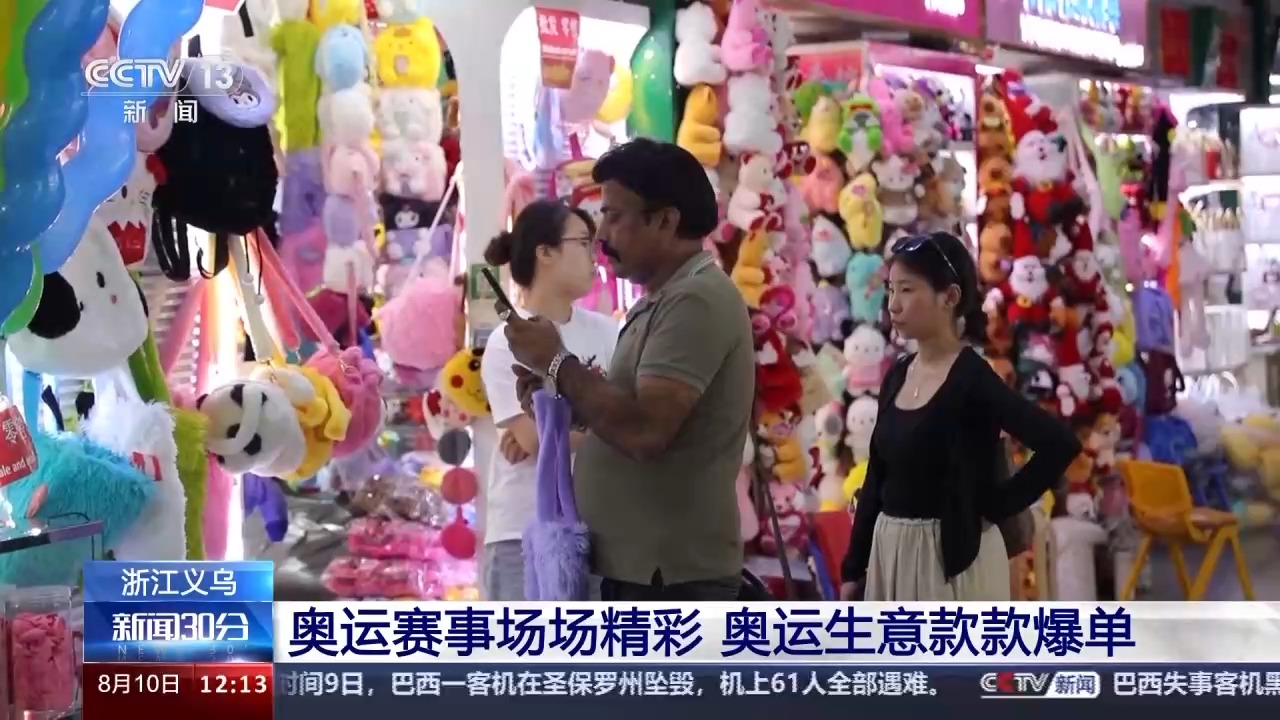 搭乘奧運(yùn)東風(fēng)的不僅是體育健兒的同款配飾,奧運(yùn)周邊產(chǎn)品也備受市場(chǎng)青睞。在義烏國(guó)際商貿(mào)城,這里匯集26個(gè)大類(lèi)、210多萬(wàn)種商品,不僅滿(mǎn)足了全球觀(guān)眾和參賽者的需求,也給義烏商家?guī)?lái)了明顯的經(jīng)濟(jì)效益。