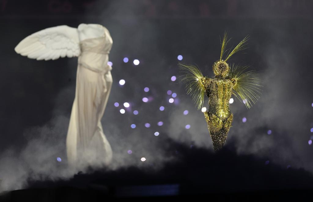 夜幕降臨,法蘭西體育場進(jìn)入另一個(gè)時(shí)空——一個(gè)奧運(yùn)會消失的世界。金色旅行者從天而降,隨著他的腳步,人們踏上一場夢幻般的探索。希臘國旗、奧運(yùn)五環(huán)……與奧林匹克相關(guān)的遺跡逐漸被發(fā)掘。