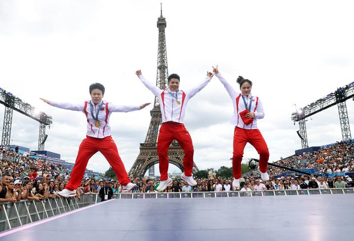 8月9日,中國舉重選手侯志慧(左)、李發(fā)彬(中)和羅詩芳在冠軍公園慶祝。當(dāng)日,觀眾來到位于法國巴黎特羅卡德羅廣場的冠軍公園,與奧運(yùn)獎牌獲得者分享榮耀。新華社記者 雒圓 攝