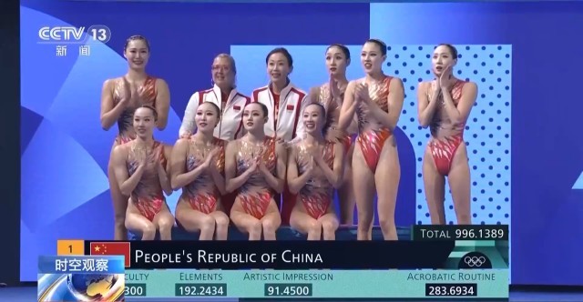 996.1389分!中國花游姑娘們以三場比賽穩(wěn)居第一的優(yōu)異表現(xiàn),贏得了中國花游在奧運(yùn)會上奪得的首枚金牌。
