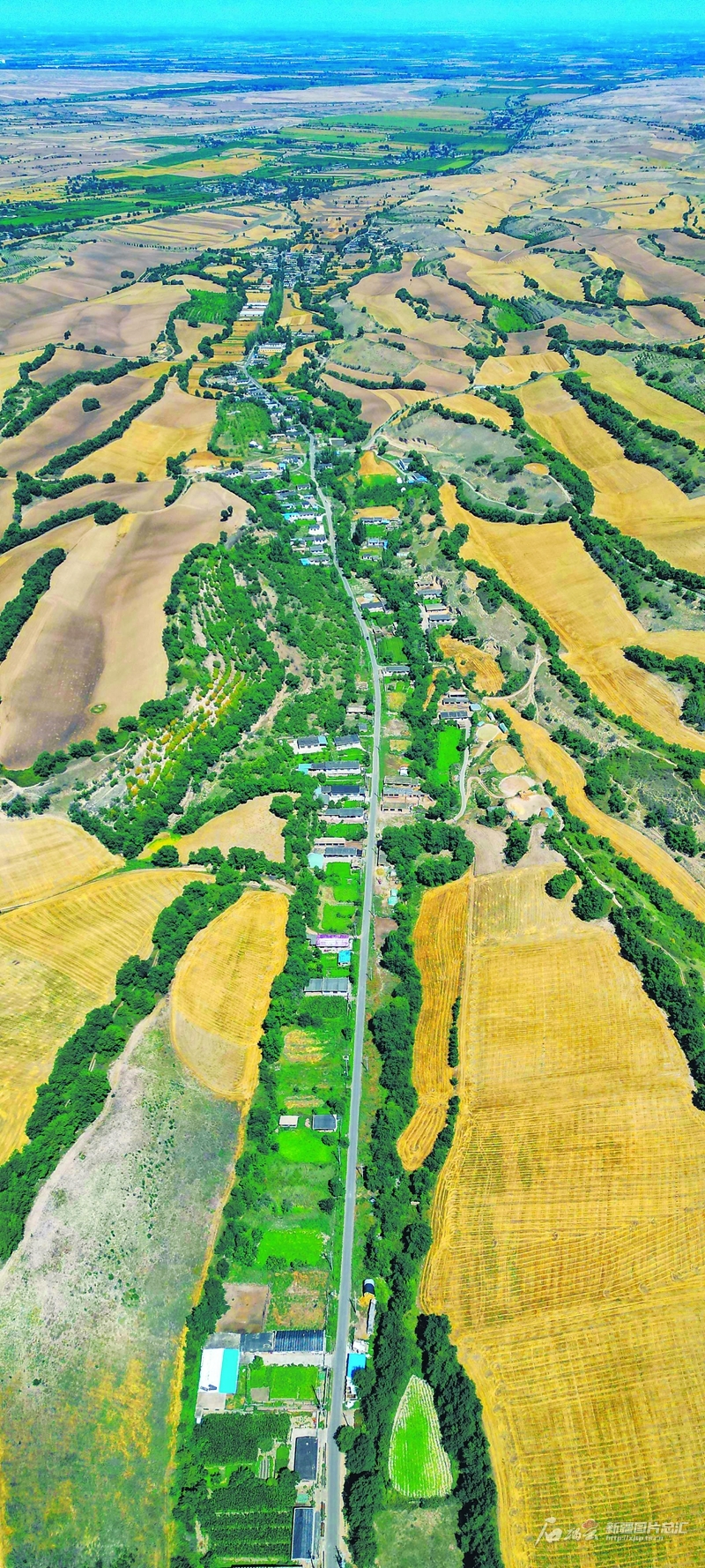 俯瞰木壘哈薩克自治縣英格堡鄉(xiāng)廟爾溝村(8月2日無(wú)人機(jī)攝)。通過(guò)廟爾溝村的鄉(xiāng)道串聯(lián)著戶戶農(nóng)家,也串聯(lián)出鄉(xiāng)村振興新圖景。 石榴云/新疆日?qǐng)?bào)記者蔡增樂(lè)攝