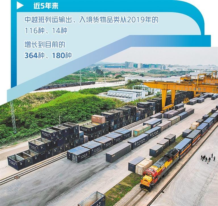 數(shù)據(jù)表明,高效、實(shí)惠、便捷的中越班列已得到市場(chǎng)認(rèn)可。近5年來,中越班列運(yùn)輸出、入境貨物品類從2019年的116種、14種,增長(zhǎng)到目前的364種、180種。中越班列集貨地已覆蓋廣西及周邊省份20多個(gè)地市,跨境貨物運(yùn)輸覆蓋越南、老撾、泰國等多個(gè)東盟國家。