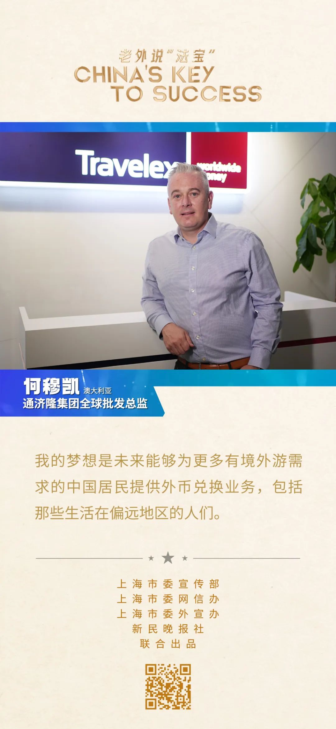 何穆凱所在的通濟(jì)隆集團(tuán)是一家以從事貨幣金融服務(wù)為主的企業(yè)。這些年,中國出境游市場蓬勃發(fā)展,讓這家公司在中國市場取得了巨大成功。“我的夢想是未來能夠?yàn)楦嘤芯惩庥涡枨蟮闹袊用裉峁┩鈳艃稉Q業(yè)務(wù),包括那些生活在偏遠(yuǎn)地區(qū)的人們?!?/strong>