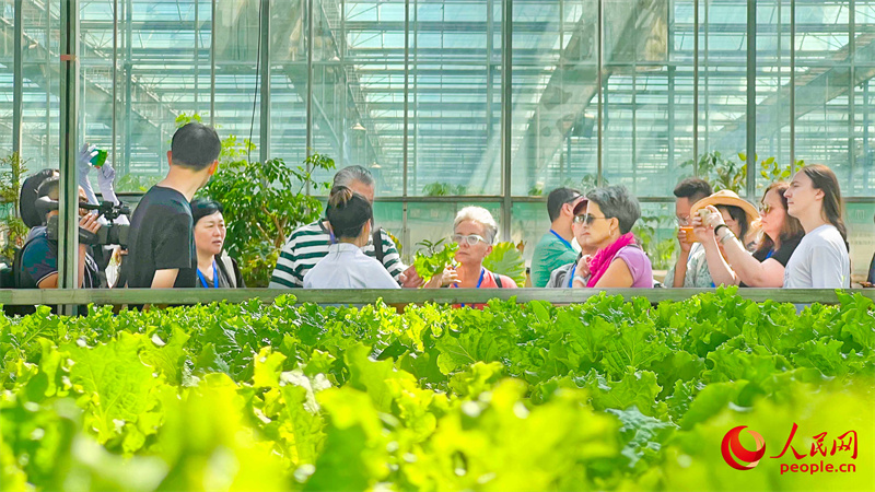 在新疆昌吉農(nóng)業(yè)博覽園,中外漢學(xué)家、翻譯家、作家參觀新疆現(xiàn)代農(nóng)業(yè)種植情況。人民網(wǎng) 李欣洋攝