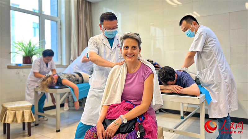 在新疆醫(yī)科大學(xué)一附院(昌吉分院),中外漢學(xué)家、翻譯家、作家參觀中醫(yī)館,體驗中醫(yī)文化。人民網(wǎng) 李欣洋攝