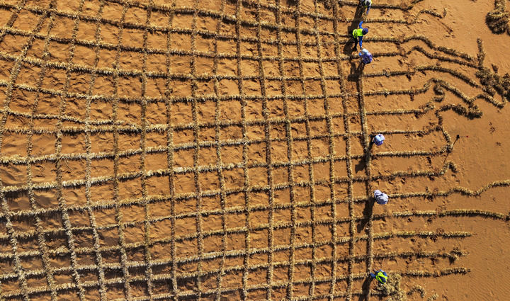 治沙工人在寧夏中衛(wèi)市境內的騰格里沙漠鋪設刷狀網繩式草方格沙障(2024年5月30日攝,無人機照片)。