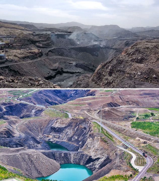 拼版照片,上圖為:位于寧夏石嘴山市的賀蘭山石炭井礦區(qū)(2017年5月30日攝,新華社發(fā));下圖為:2024年8月6日拍攝的修復治理后的賀蘭山石炭井礦區(qū)(無人機照片,新華社記者馮開華攝)。