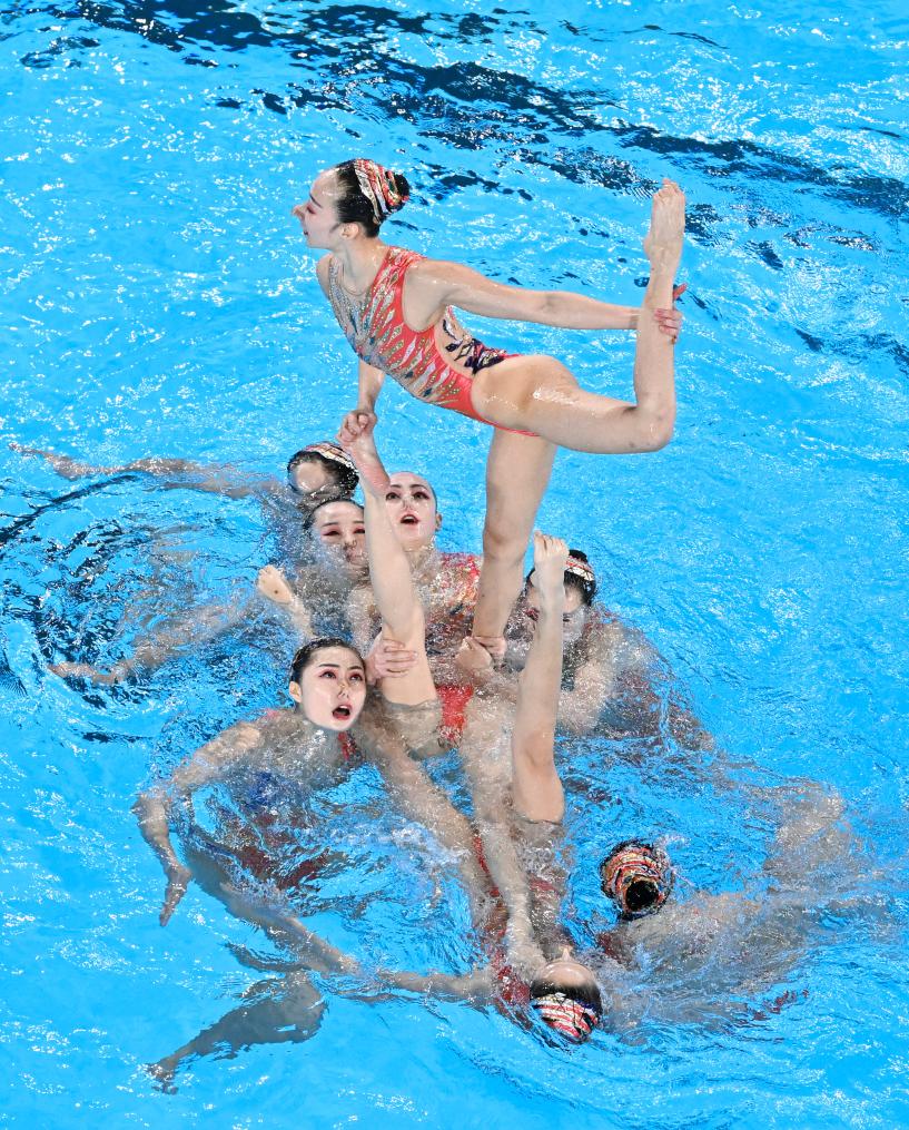8月7日,中國隊在巴黎奧運會花樣游泳集體技巧自選比賽中。新華社記者 夏一方 攝