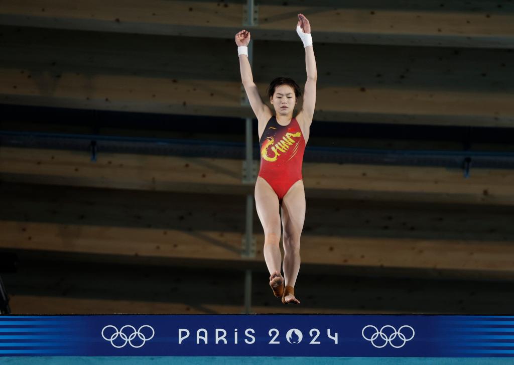 8月5日,中國選手全紅嬋在巴黎奧運會跳水女子10米臺半決賽中。新華社記者 張玉薇 攝