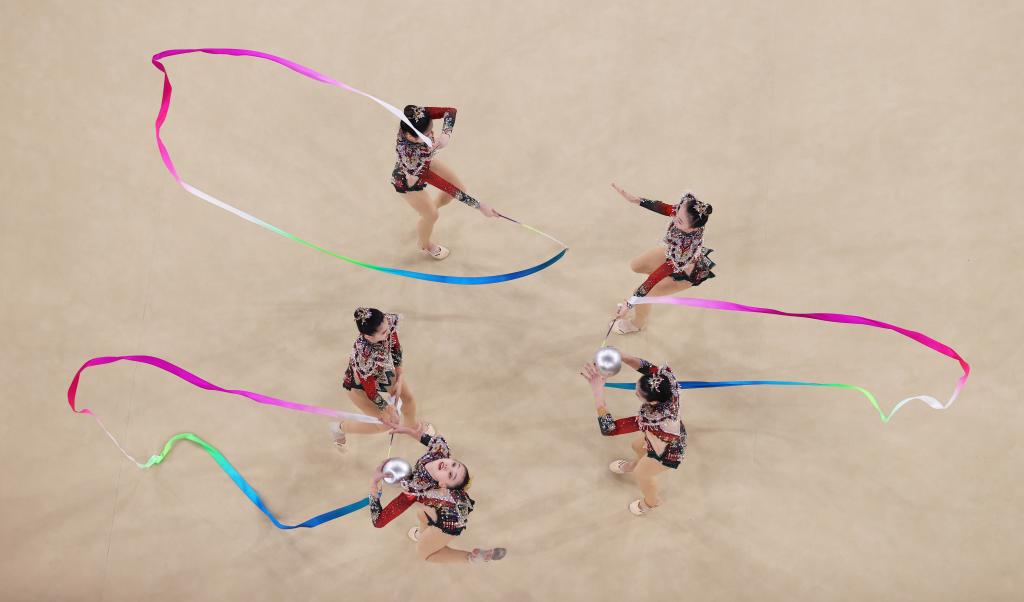 8月10日,中國隊在巴黎奧運會藝術體操項目集體全能決賽中。新華社記者 郭昱 攝