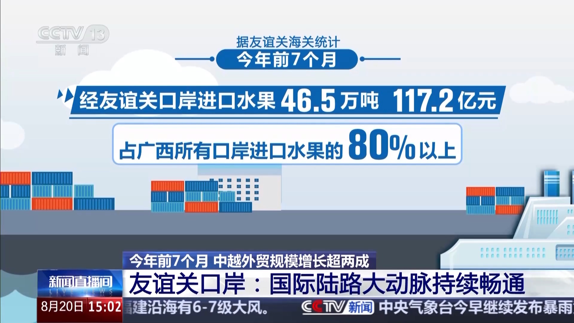 據(jù)友誼關(guān)海關(guān)統(tǒng)計,今年前7個月,經(jīng)友誼關(guān)口岸進(jìn)口水果46.5萬噸、117.2億元,占廣西所有口岸進(jìn)口水果的80%以上。
