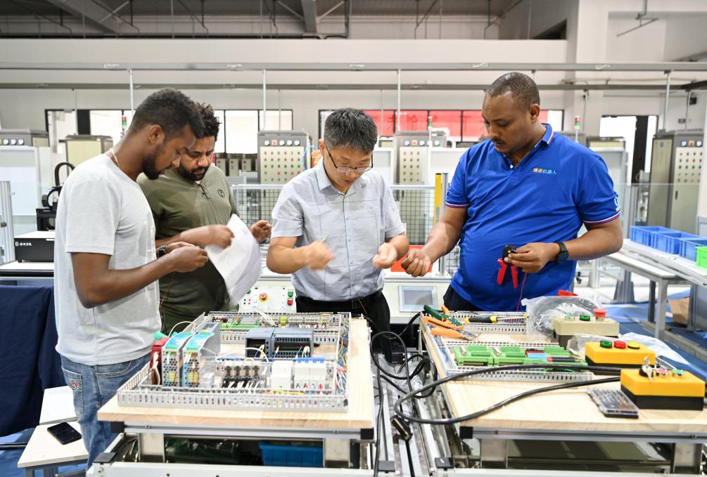 在天津職業(yè)技術(shù)師范大學(xué),老師帶領(lǐng)韓士蘭(右一)和其他留學(xué)生進(jìn)行實(shí)訓(xùn)操作(2022年7月29日攝)。韓士蘭來(lái)自埃塞俄比亞,在天津?qū)W習(xí)期間,韓士蘭積極利用學(xué)校先進(jìn)的職業(yè)教育實(shí)踐條件,專注于人工智能制造和工業(yè)機(jī)器人方向的研究。新華社記者李然 攝
