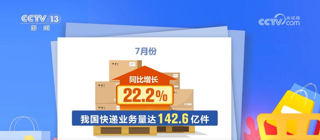 同時,線上消費增勢較好。1—7月,實物商品網上零售額同比增長8.7%,占社零總額比重為25.6%。7月份,我國快遞業(yè)務量達142.6億件,同比增長22.2%。