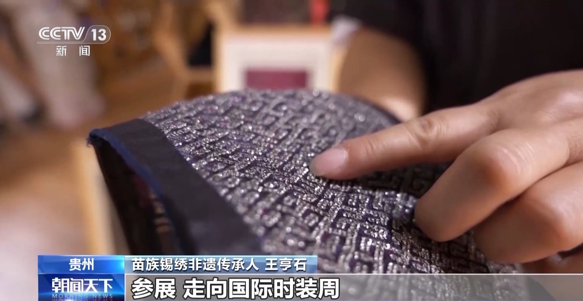 苗族錫繡非遺傳承人 王亨石:按照他要尺寸的大小自己繡出來(lái),繡出來(lái)以后寄給他,他自己再設(shè)計(jì)出作品,參展,走向國(guó)際時(shí)裝周。我想生在大山里面幾百年的錫繡,今天能走上這么高的國(guó)際舞臺(tái),我真的感到很高興而且很自豪。