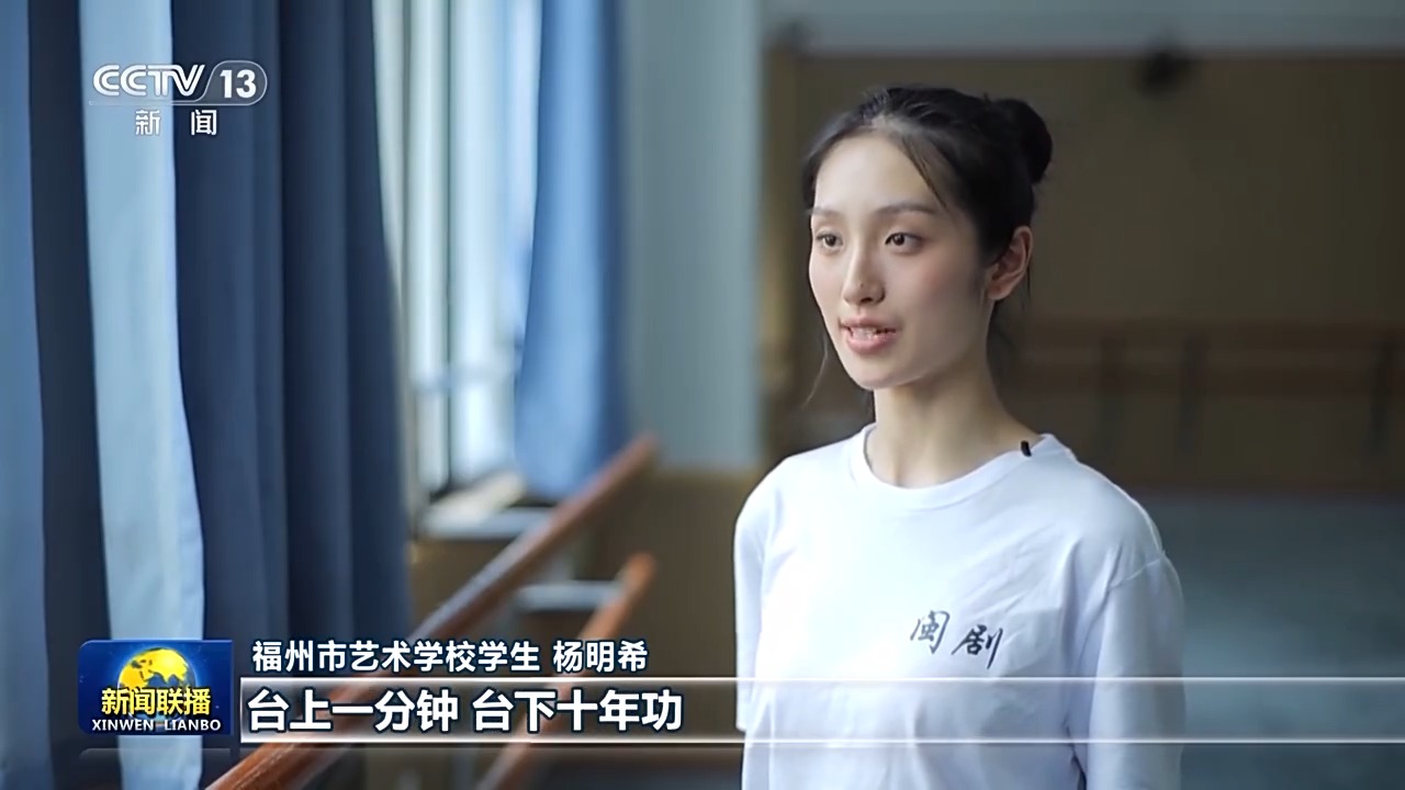 福州市藝術(shù)學(xué)校學(xué)生 楊明希:勤學(xué)苦練,振興閩劇,這八個字時刻提醒我們臺上一分鐘,臺下十年功。我們要學(xué)好文化,又要學(xué)好專業(yè),學(xué)閩劇一定要吃苦才能把基本功打?qū)崱?/p>