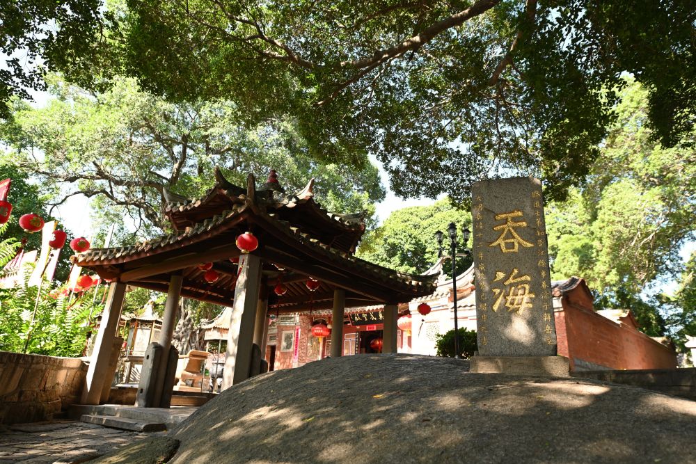 泉州市豐澤區(qū)真武廟前,一方巨石拱出地面、宛如龜背,上方石碑篆刻的“吞海”兩個(gè)大字,彰顯了泉州人征服大海的豪情。