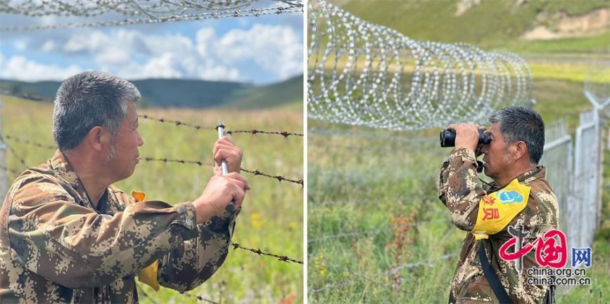 巡邊時(shí),王玉發(fā)拿著望遠(yuǎn)鏡眺望遠(yuǎn)方,看到松動(dòng)的鐵絲網(wǎng),用鉗子和錐子加固。中國(guó)網(wǎng)記者 吳佳潼 攝