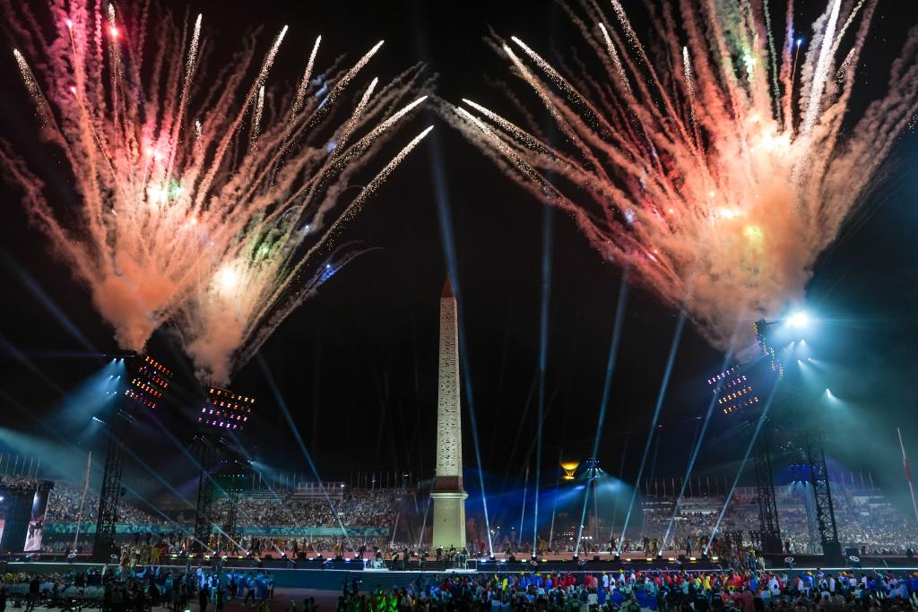 8月28日,巴黎協(xié)和廣場(chǎng)開幕式現(xiàn)場(chǎng)的焰火表演。新華社記者 張鋮 攝