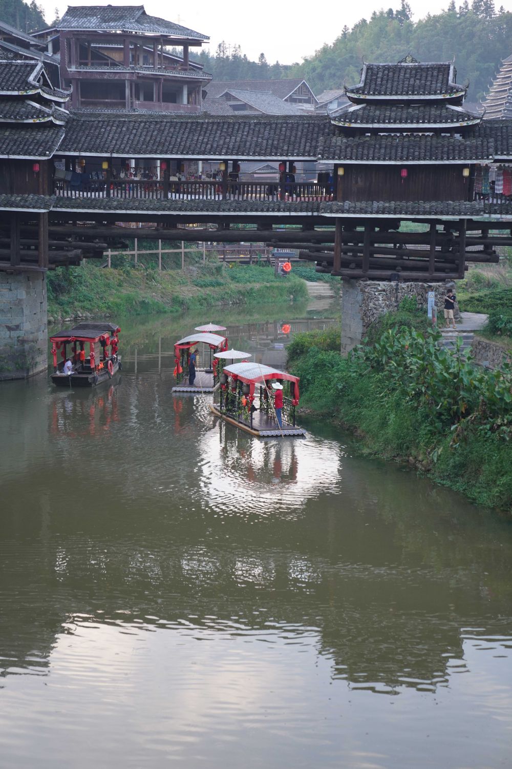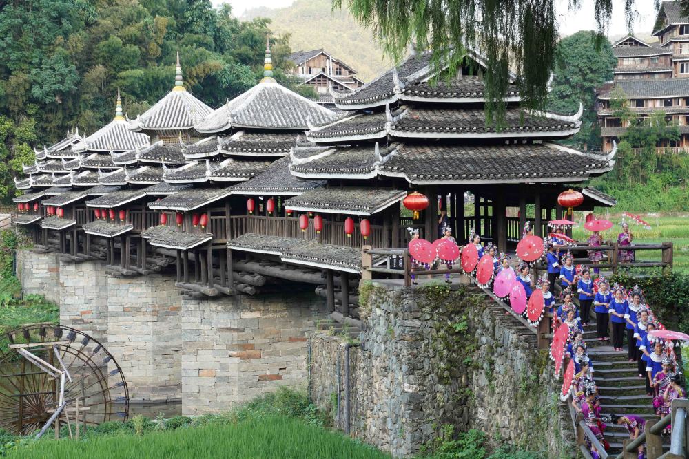 侗寨跨水而建。進入程陽八寨,首先要走過今年迎來100歲生日的程陽永濟橋。此橋是樓閣式建筑,整座橋梁搭建時不用一釘一鉚,主要由木料和石料建成,橋長近80米,寬近4米,高近12米,是我國建筑藝術(shù)中的珍品。