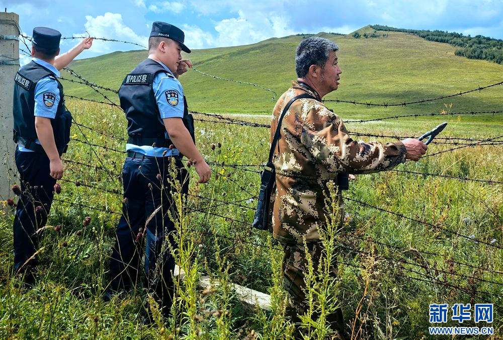 ??王玉發(fā)(右)與邊境警察在修補網(wǎng)圍欄。新華網(wǎng)發(fā)