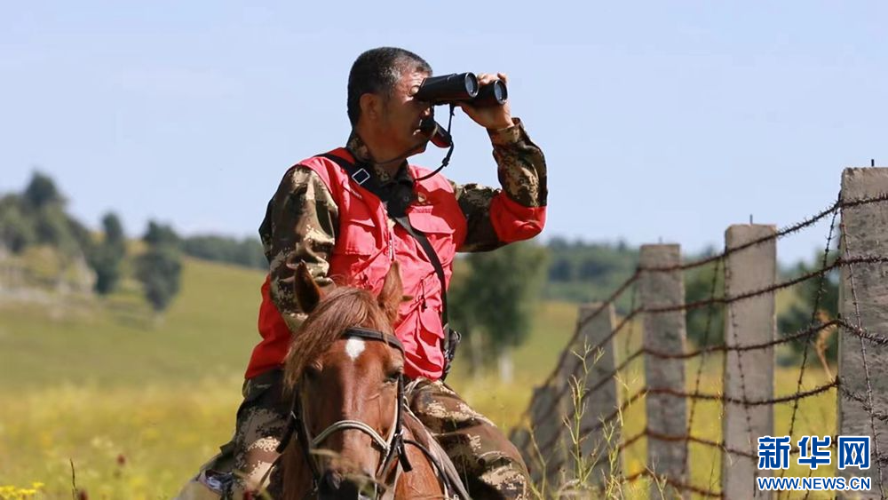 ??王玉發(fā)在騎馬巡邊時用望遠鏡觀察遠處情況。新華網(wǎng)發(fā)