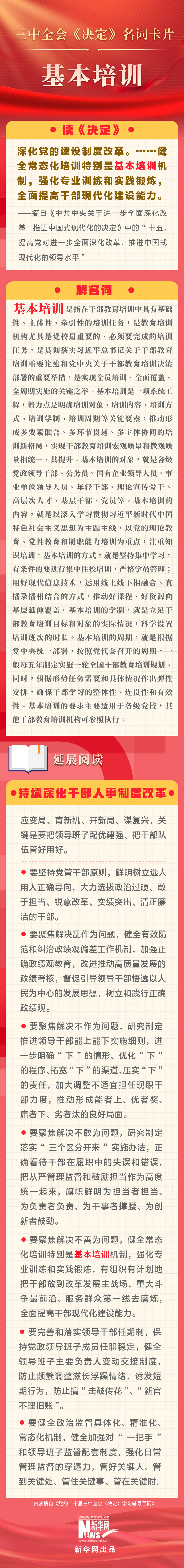 黨的二十屆三中全會(huì)審議通過(guò)了《中共中央關(guān)于進(jìn)一步全面深化改革、推進(jìn)中國(guó)式現(xiàn)代化的決定》。新華網(wǎng)依據(jù)《黨的二十屆三中全會(huì)〈決定〉學(xué)習(xí)輔導(dǎo)百問(wèn)》,制作三中全會(huì)《決定》系列名詞卡片,和大家一起來(lái)深入學(xué)習(xí)領(lǐng)會(huì)二十屆三中全會(huì)精神。本期名詞是“基本培訓(xùn)”。