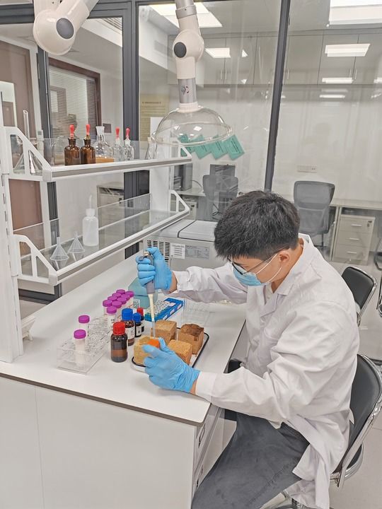2024年7月8日,研究人員在杭州良渚古城遺址世界遺產(chǎn)監(jiān)測(cè)管理中心的潮濕環(huán)境土遺址保護(hù)實(shí)驗(yàn)室進(jìn)行試驗(yàn)。 新華社記者 馮源 攝