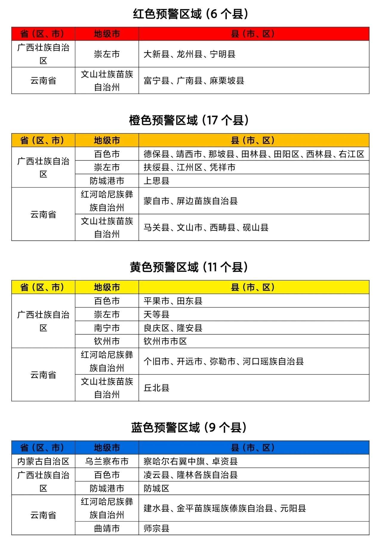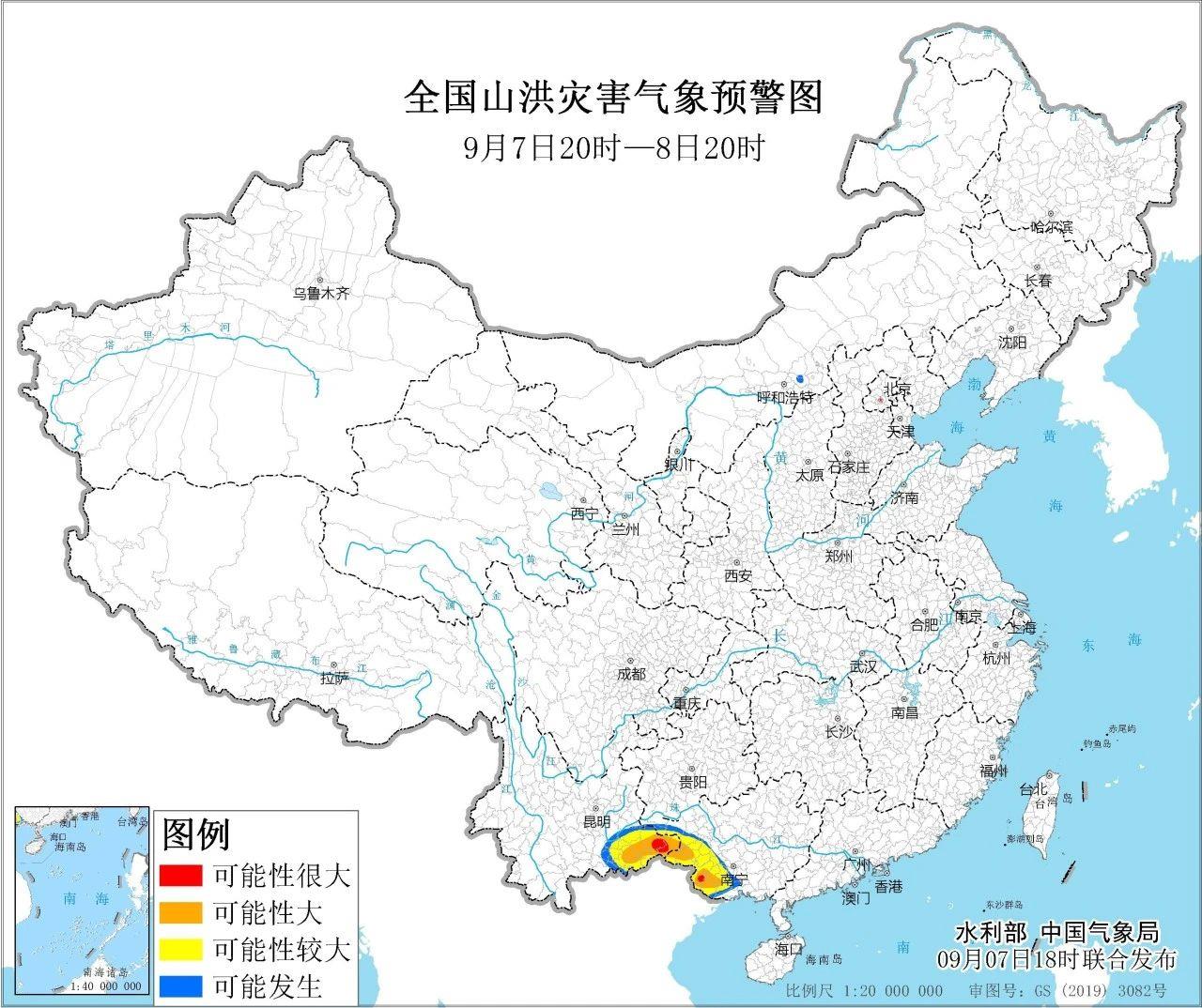 預(yù)計(jì),9月7日20時至9月8日20時,廣西西部和西南部、云南東部等地部分地區(qū)發(fā)生山洪災(zāi)害可能性大(橙色預(yù)警),其中,廣西西南部、云南東部局地發(fā)生山洪災(zāi)害可能性很大(紅色預(yù)警)。其他地區(qū)也可能因局地短歷時強(qiáng)降水引發(fā)山洪災(zāi)害,請各地注意做好實(shí)時監(jiān)測、防汛預(yù)警和轉(zhuǎn)移避險等防范工作。