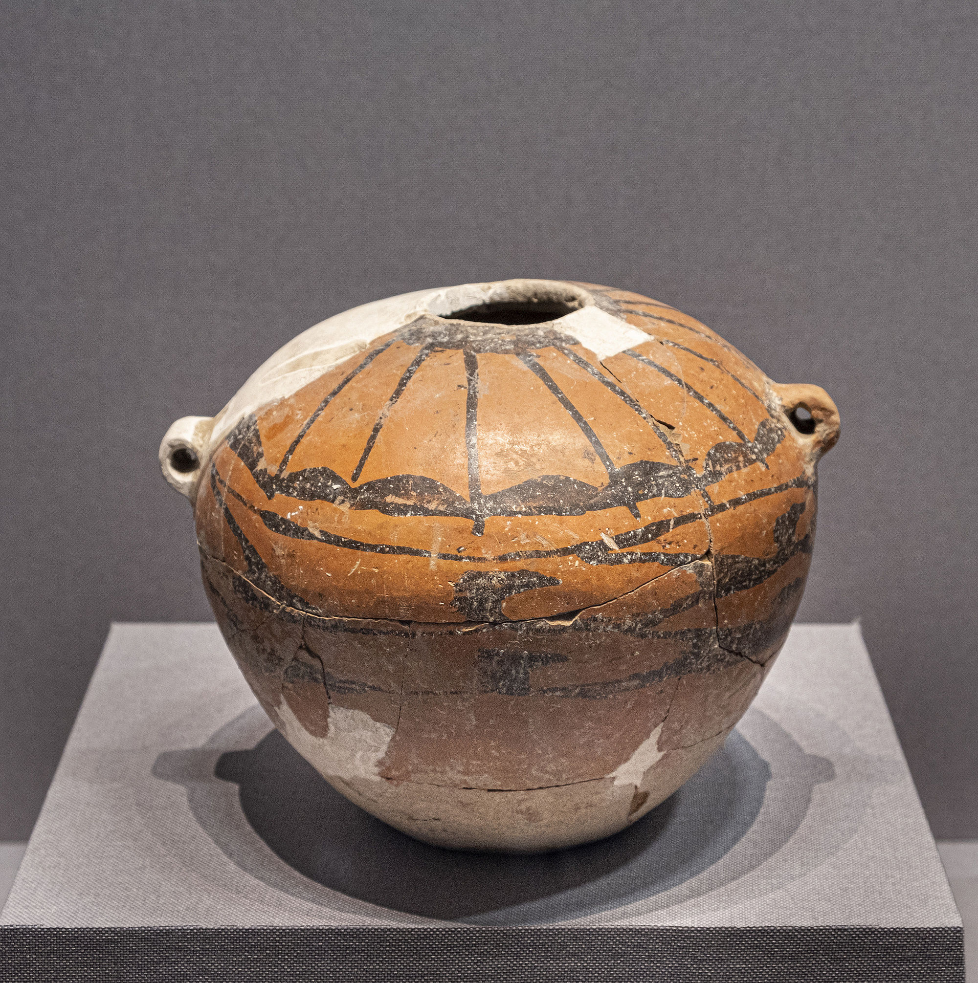 這件彩陶雙耳罐,有寬大的肩膀,圓圓的嘴巴,鼓鼓的肚子,小小的耳朵,像不像一位慈祥的老者,訴說(shuō)著五六千年前的往事呢?
