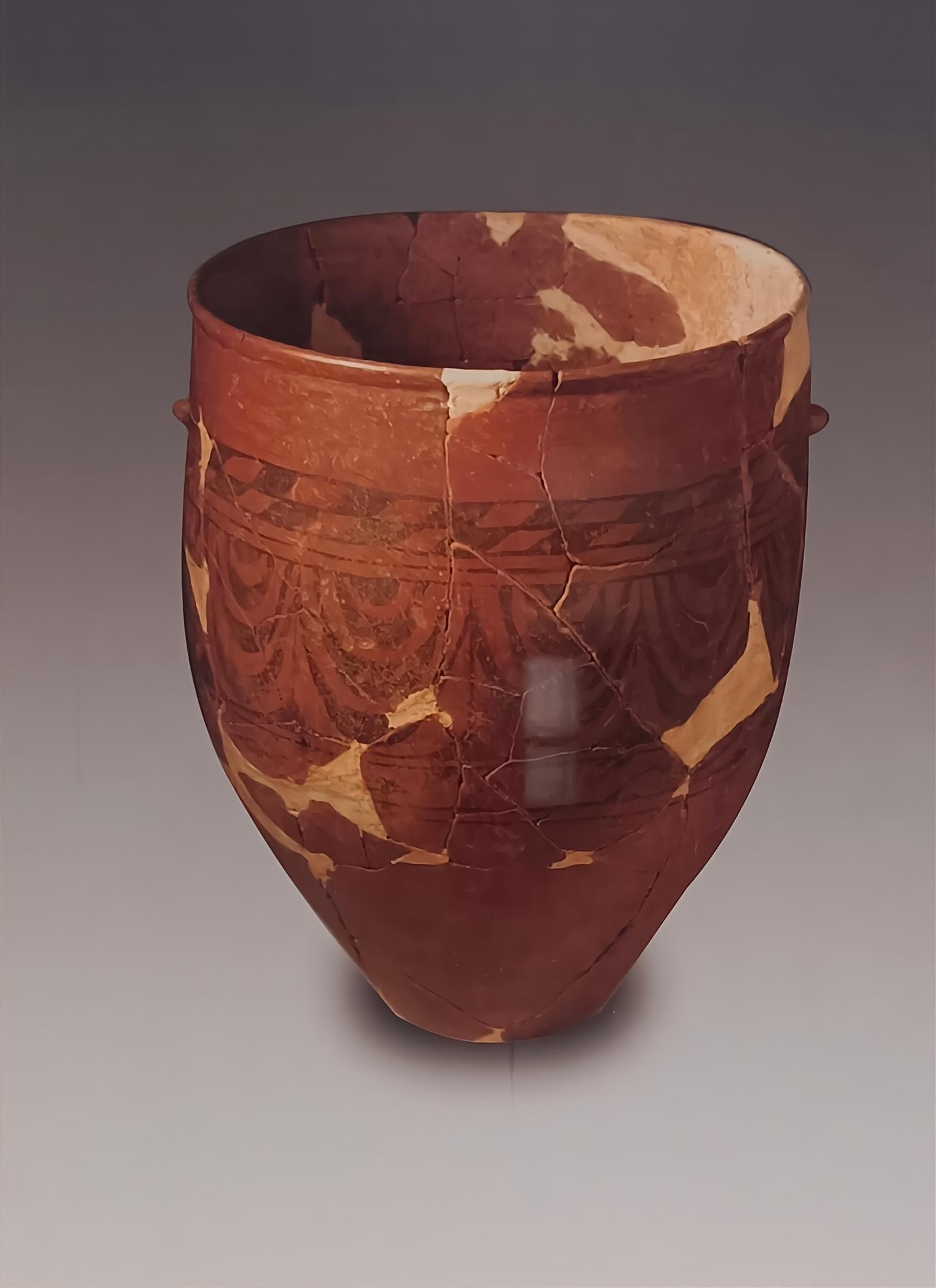 這件彩繪平底筒形罐最上面的菱形方格紋來(lái)自中亞地區(qū),其下一片片的龍鱗紋是赤峰地區(qū)的本土元素,下方勾連狀的抽象玫瑰花圖案,則是仰韶文化的元素,體現(xiàn)了5500年前三種文化在草原深處碰撞出的文明火花。