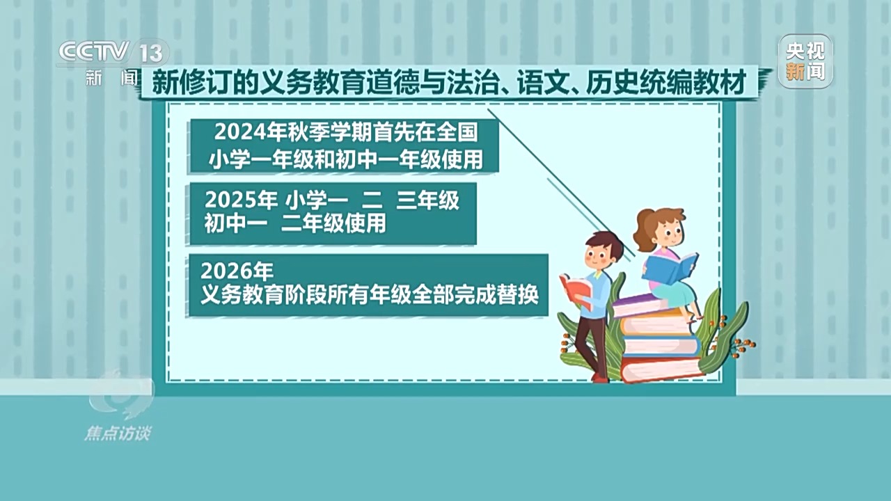 今年秋季學期,修訂后的教材在小學一年級和初中一年級投入使用;2025年,小學一、二、三年級和初中一、二年級使用;2026年,義務(wù)教育階段所有年級全部完成替換。