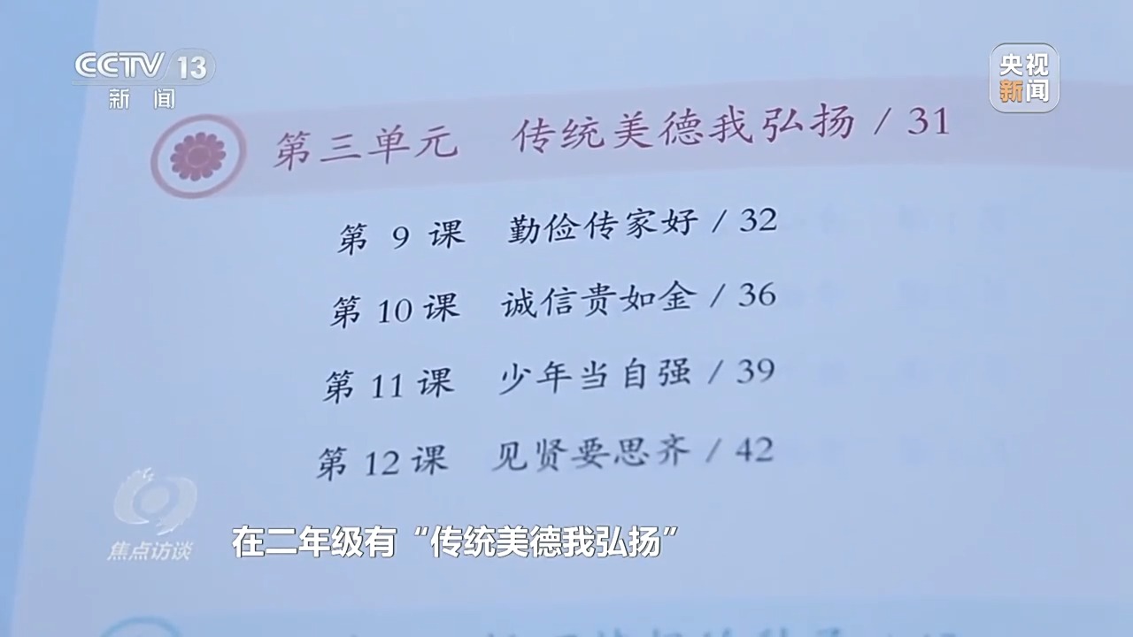 義務(wù)教育道德與法治統(tǒng)編教材編委會主任 孫蚌珠:為了讓學生循序漸進地了解中華優(yōu)秀傳統(tǒng)文化,堅定文化自信,在二年級有“傳統(tǒng)美德我弘揚”,四年級有“博大精深的中華優(yōu)秀傳統(tǒng)文化”,七年級有“傳承中華優(yōu)秀傳統(tǒng)文化”,這樣層層遞進。