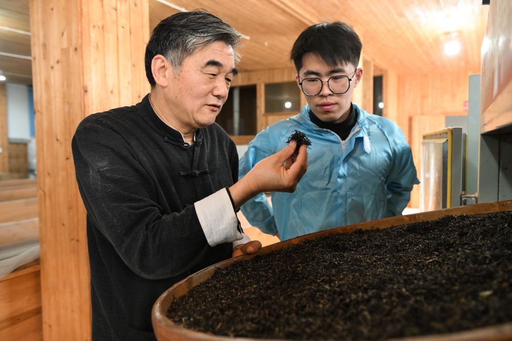 在蘇州市吳中區(qū)東山鎮(zhèn),蘇州市碧螺春制作技藝非物質(zhì)文化遺產(chǎn)代表性傳承人嚴(yán)介龍?jiān)趥魇谕降芗t茶制作要領(lǐng)(4月11日攝)。