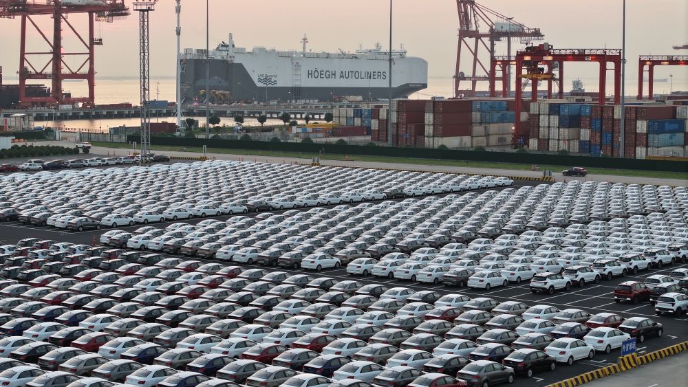 汽車運(yùn)輸船“禮諾極光”輪靠泊江蘇省蘇州港太倉(cāng)港區(qū),即將裝載2336輛汽車首航歐洲(無(wú)人機(jī)照片,8月23日攝)。