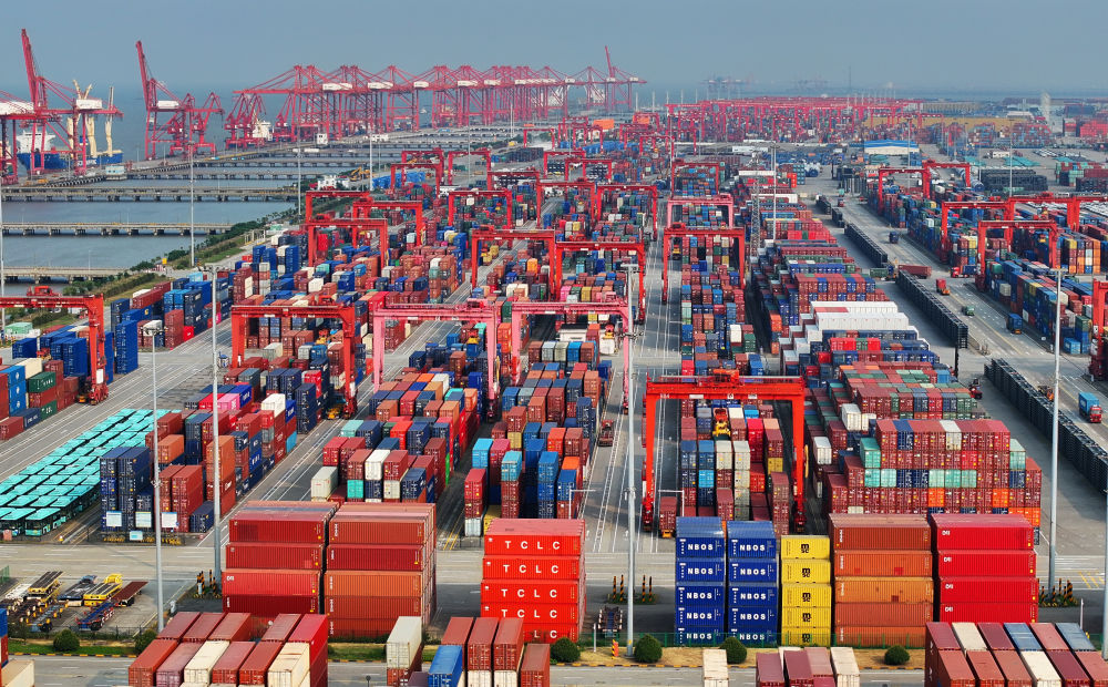 江蘇省蘇州港太倉(cāng)港區(qū)集裝箱碼頭,集裝箱吞吐作業(yè)繁忙(無(wú)人機(jī)照片,8月10日攝)。
