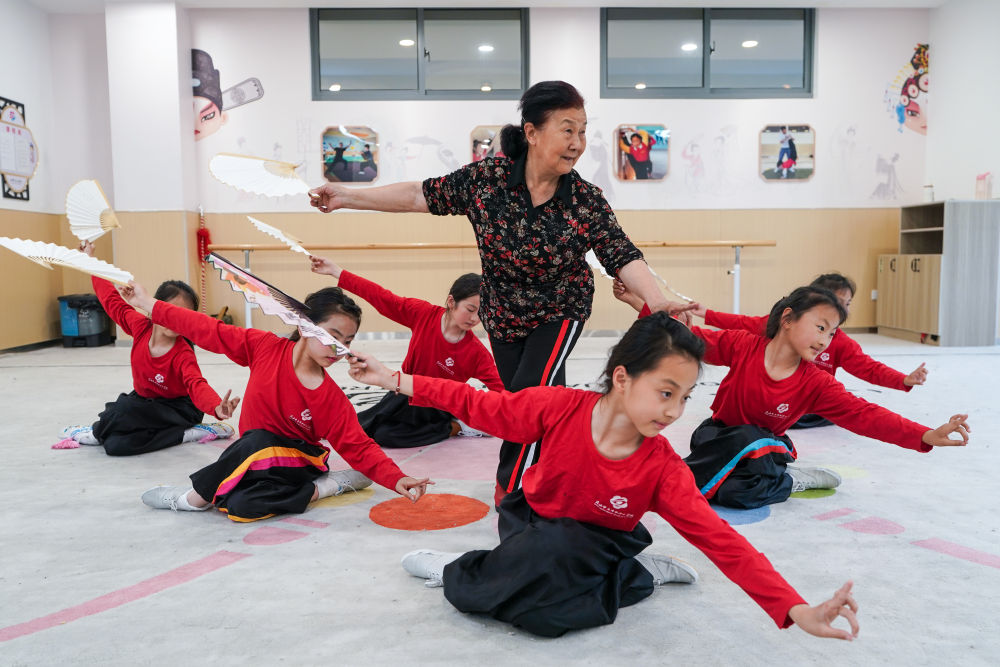 在江蘇蘇州昆山市石牌中心小學(xué)?!傲?xí)美樓”的訓(xùn)練房?jī)?nèi),昆曲老師吳美玉(中)帶著小昆班的學(xué)員們進(jìn)行扇舞訓(xùn)練(5月30日攝)。