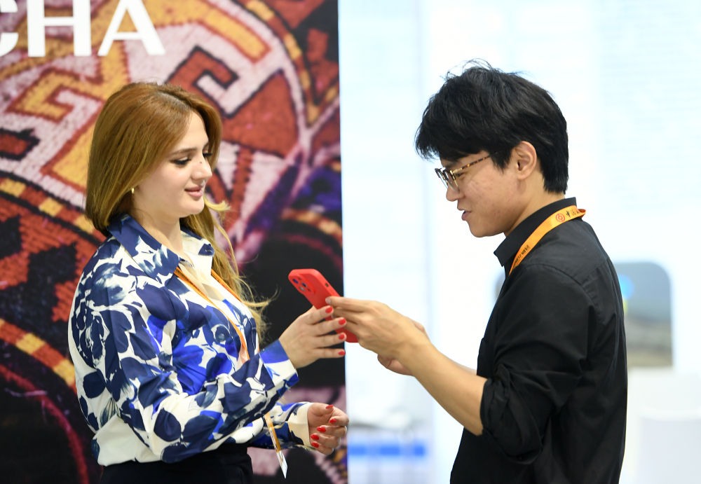 9月15日,在服貿(mào)會國家會議中心展區(qū),阿塞拜疆展臺的參展商(左)與一名中方工作人員交流。新華社記者 逯陽 攝