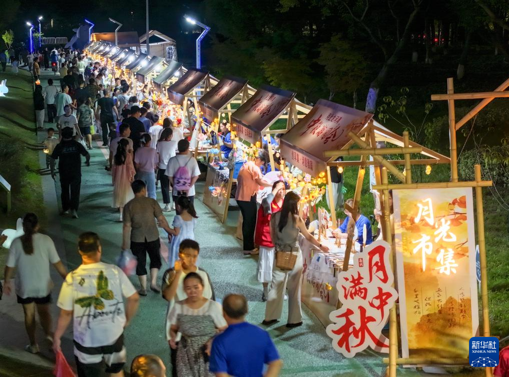 9月15日,游客在江蘇省泰興市龍河灣公園逛“月光市集”(無人機(jī)照片)。