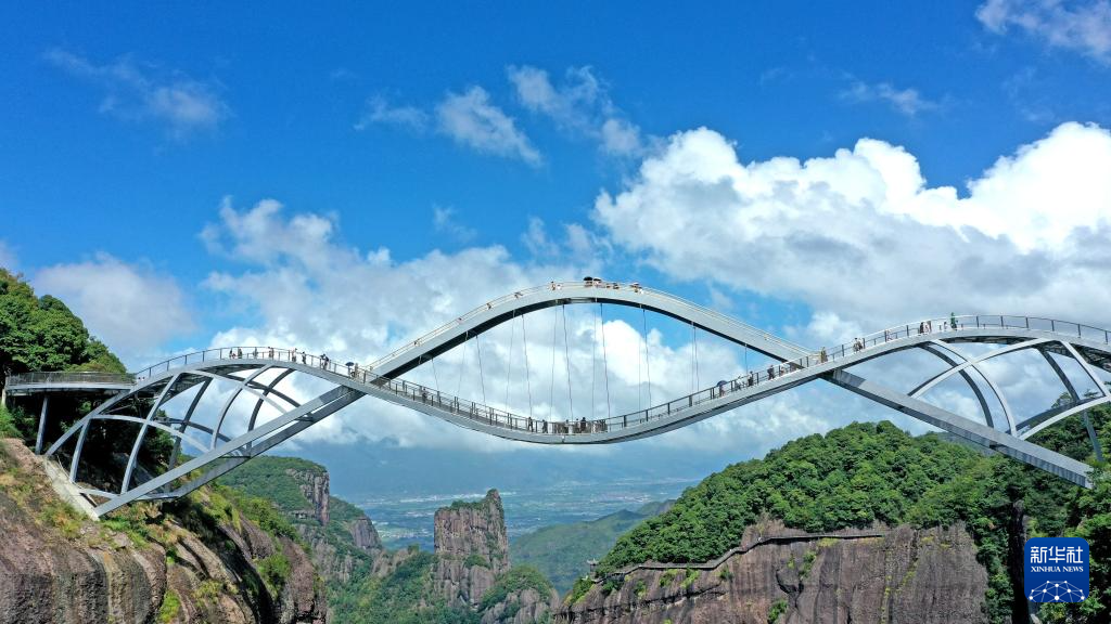 9月17日,游客在浙江省臺(tái)州市仙居縣神仙居景區(qū)如意橋上游玩(無人機(jī)照片)。