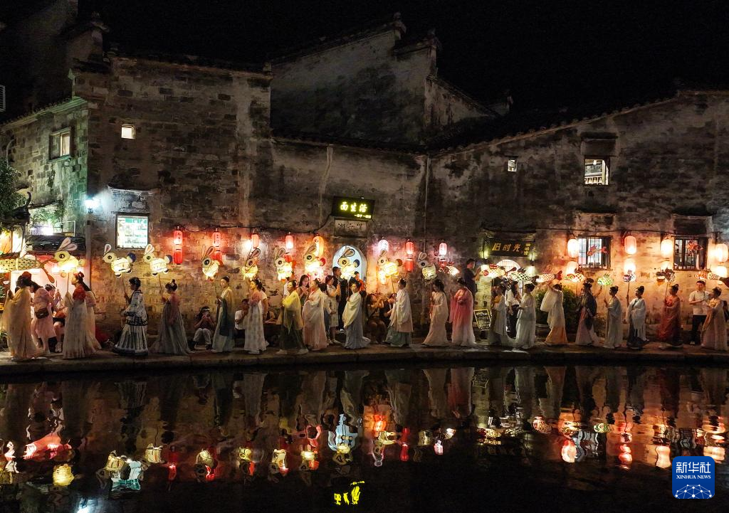 9月15日,花燈表演隊(duì)伍在安徽省黃山市黟縣宏村巡游(無人機(jī)照片)。