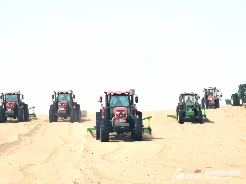 在后河壩二期治沙現(xiàn)場,亞森·奧斯曼聯(lián)合其他承包戶,集合了17輛拖拉機平整沙地。拖拉機一字排開向前推進(jìn),場面非常壯觀。