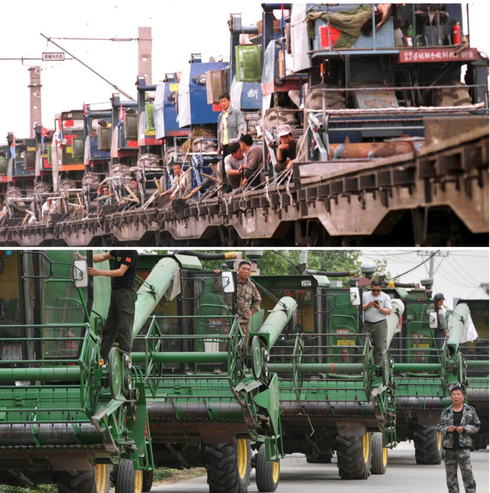 拼版照片:上圖為1999年,滿載著參加跨區(qū)收割小麥作業(yè)收割機的專列從石家莊鐵路分局正定火車站開出,將河北深州、藁城等地農(nóng)民的120多臺收割機運往河南開封(新華社記者 周文廣 攝);下圖為2020年6月2日,在河南周口黃泛區(qū)農(nóng)場九分場,農(nóng)機隊伍準備出發(fā)(新華社記者 李嘉南 攝)。