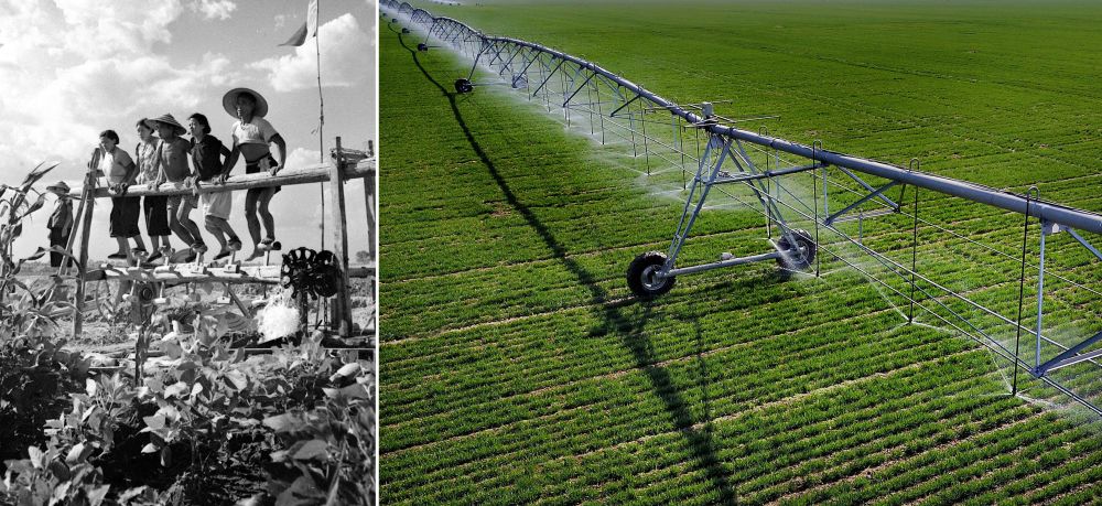 拼版照片:左圖為20世紀50年代,河南郾城萬金公社社員在踩水車澆田(魏德忠 攝);右圖為2017年3月9日,在河南??h王莊鎮(zhèn)一處麥田里,自走式智能噴灌機在進行噴灌作業(yè)(新華社記者 李安 攝)。