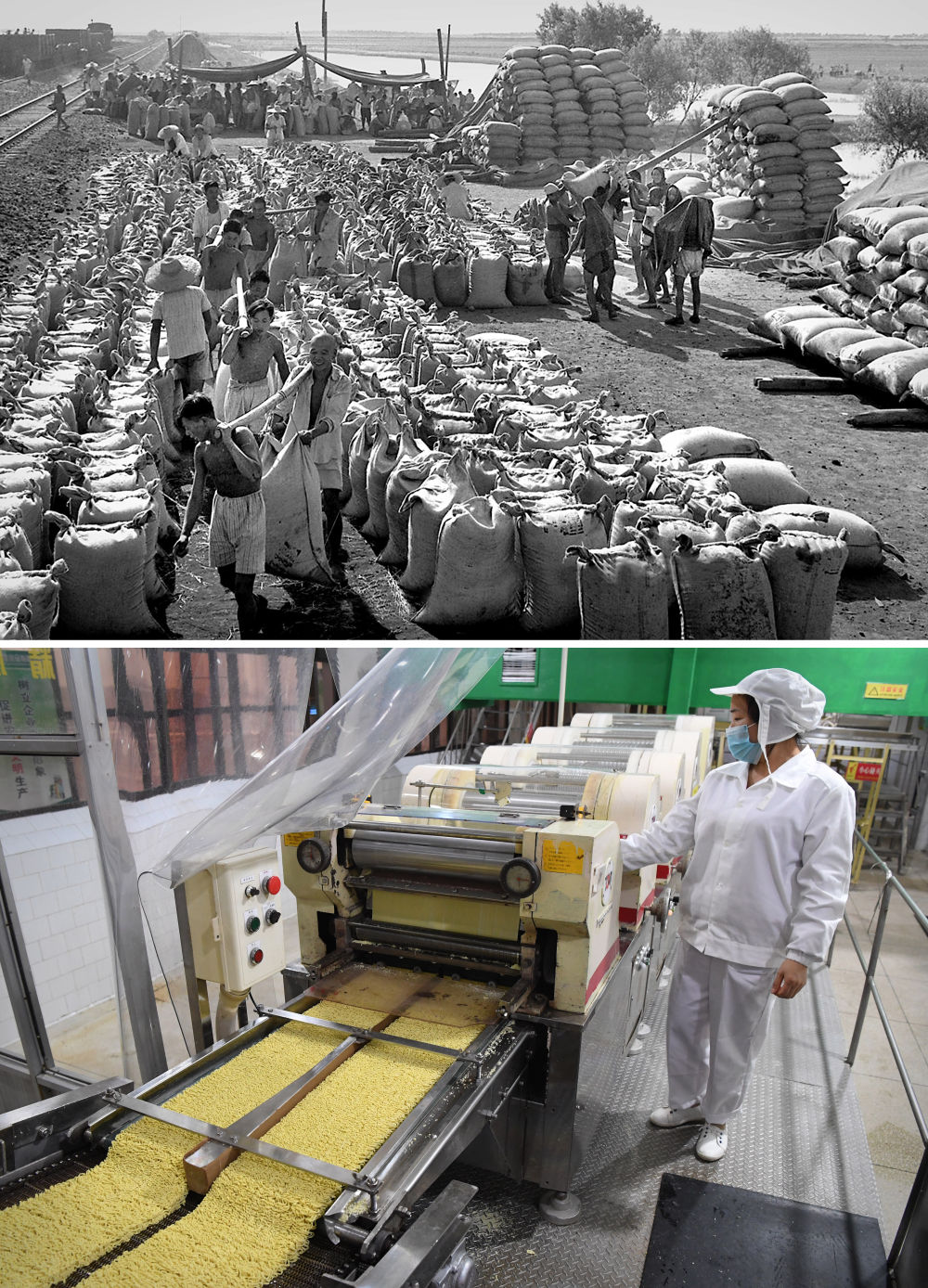 拼版照片:上圖為1963年,河南郾城裴城車站糧食收購站,堆放著大批農(nóng)民交售的原糧(新華社記者 楊丙文 攝);下圖為2018年11月27日,在河南臨潁一家方便面生產(chǎn)企業(yè),工作人員在車間流水線上作業(yè)(新華社記者 李安 攝)。