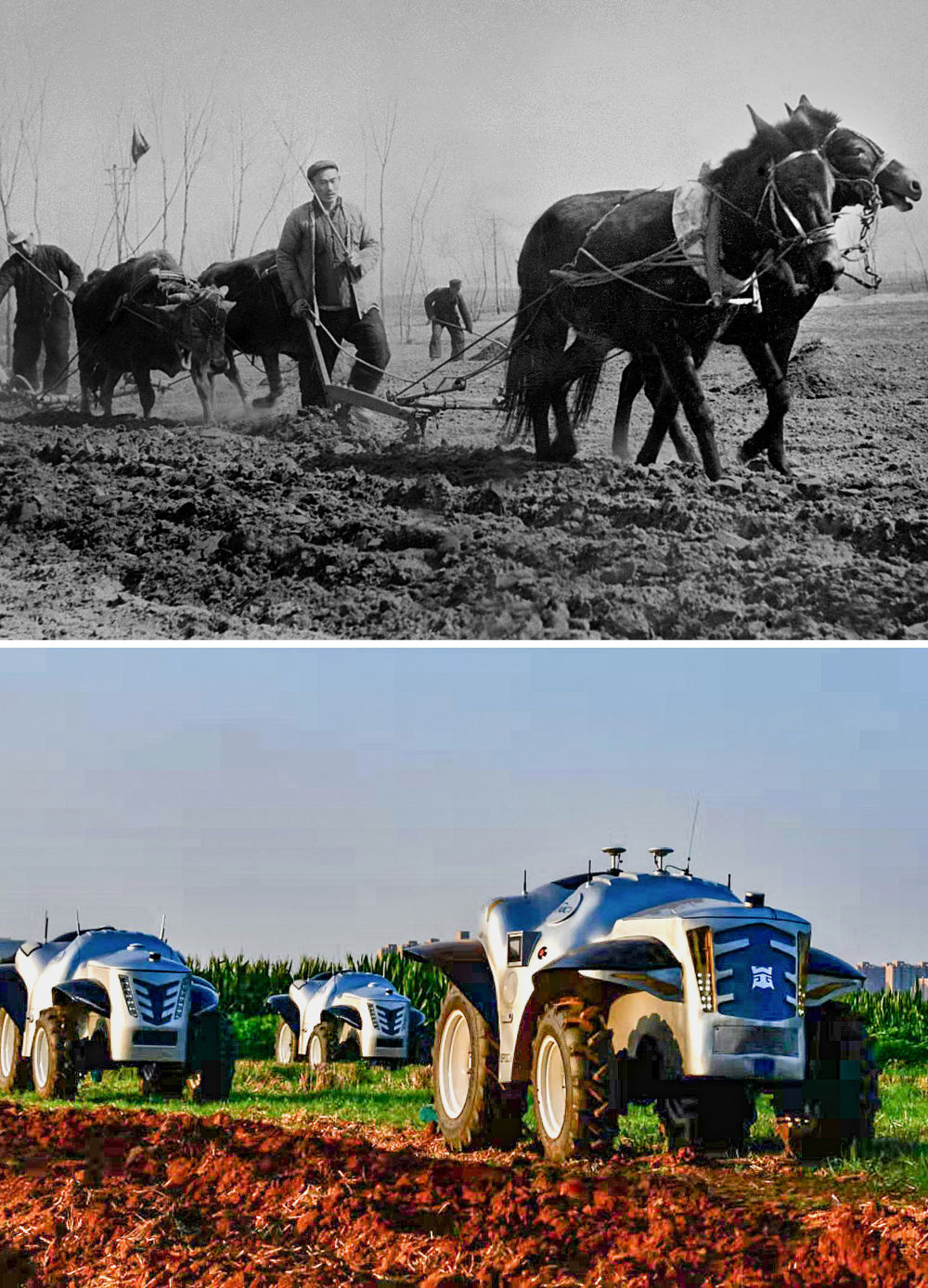 拼版照片:上圖為1954年,河南開封農(nóng)民在用傳統(tǒng)的畜拉步犁耕地(呂學召 攝);下圖為2019年7月26日,洛陽一拖集團生產(chǎn)的純電動無人駕駛拖拉機準備做耕地測試(潘郁 攝)。