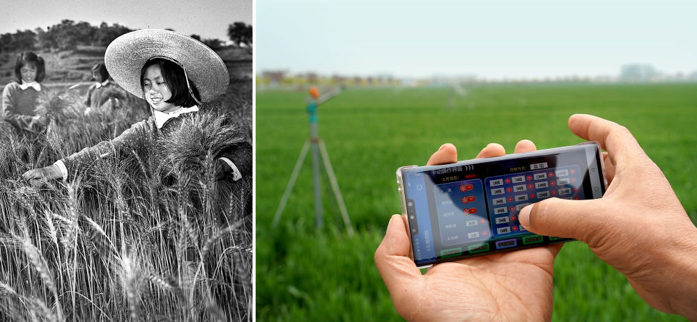 拼版照片:左圖為1961年,河南新縣陡山河鄉(xiāng)的技術員在進行田間調(diào)查,確定小麥選種地塊(新華社記者 張青云 攝);右圖為2021年4月14日,在河南商水一處高標準農(nóng)田里,種糧大戶邱守先使用手機操控設備對小麥田進行自動噴灌(新華社記者 李安 攝)。