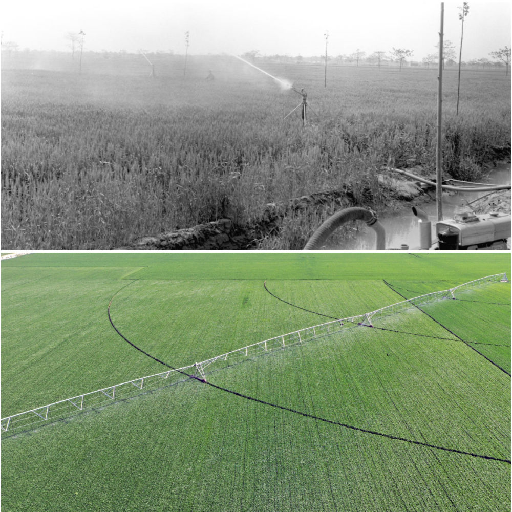 拼版照片:上圖為1981年,河南蘭考爪營公社爪營三大隊購買了12部噴灌機,在抗災中發(fā)揮了巨大作用,小麥獲得豐收(新華社記者 朱廣智 攝);下圖為2020年4月24日,在河南省浚縣30萬畝高標準糧田示范區(qū)內(nèi),大型噴灌機在進行噴灌作業(yè)攝(新華社記者 李嘉南 攝)。