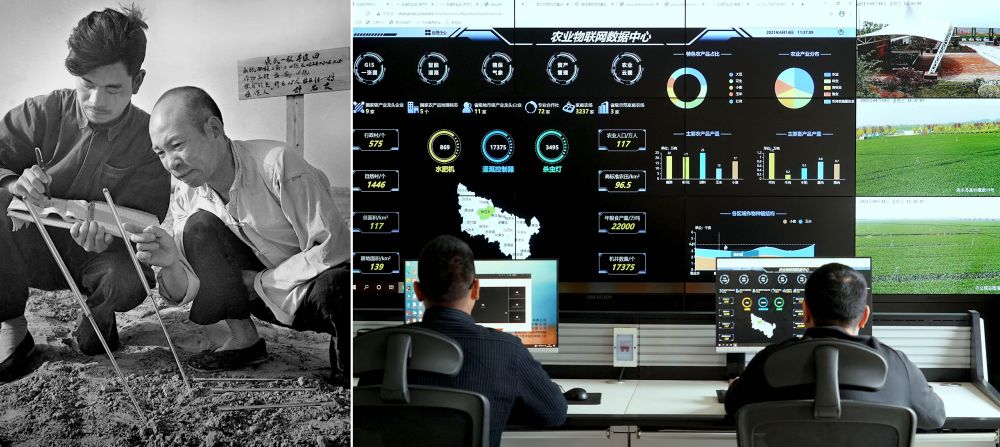 拼版照片:左圖為20世紀50年代,河南滎陽廣武農(nóng)業(yè)社社員在測量、記錄地溫(謝延華 攝);右圖為2021年4月14日,工作人員在河南商水農(nóng)業(yè)物聯(lián)網(wǎng)控制中心內(nèi)工作(新華社記者 李安 攝)。